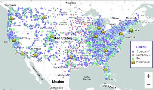 Accurate Synergy Analysis: During M&A, identifying synergies is crucial. Clean room analytics provide a structured approach to quantifying potential savings, optimizations, and revenue enhancements. This method ensures that both parties have a clear understanding of the benefits of the merger and potential watchouts. A successful analysis of these synergies should show a clear representation of customers, distributors, geographies, sales, etc., each company represents. In the example below, Precision was able to map customers by zip code for two companies exploring a merger. Each dot represents the customers in a specific zip code with a larger dot meaning higher sales for that company.
